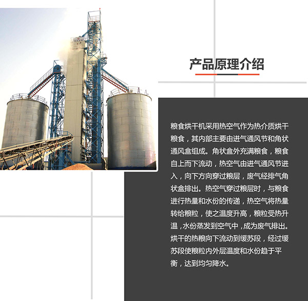 需烘干的濕糧經(jīng)均糧機構(gòu)進入糧食烘干機,當(dāng)糧食到達儲糧段的低料位時,啟動熱風(fēng)機開始送熱風(fēng)對糧食烘干;糧食到達儲糧段中料位時,料位器動作,發(fā)出電信號啟動排糧電機開始排糧;糧食到達儲糧段高料位時報警,進糧停止。此時,排糧繼續(xù)進行,糧位開始下降,當(dāng)降至中料位時,恢復(fù)進糧,如此循環(huán)進行。調(diào)整進料量,使系統(tǒng)處于動態(tài)平衡。濕糧經(jīng)過儲糧段進入布風(fēng)段后,均勻的分布在布風(fēng)段內(nèi)的各通風(fēng)節(jié)管內(nèi),熱風(fēng)在通風(fēng)節(jié)管外流動,對糧食加熱;然后糧流和熱風(fēng)同時向下流動,進入烘干段,在烘干段內(nèi)對糧食加熱,使糧食水分汽化,再以廢氣形式將汽化水分從廢氣角狀盒排出,從而使糧食得到烘干。烘干后的糧食在冷卻段內(nèi)經(jīng)過冷卻降低到合適的溫度后,由排糧段經(jīng)排料斗排出。