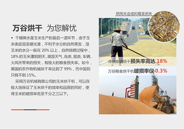 鄭州萬谷機械的糧食烘干機吸收國外先進機型的優(yōu)點、并基于我們多年的設(shè)計生產(chǎn)制造經(jīng)驗以及結(jié)合全國各地區(qū)不同緯度、濕度情況下定制化創(chuàng)新研制而成。糧食烘干機依據(jù)用戶的實際需求的不同針對性的采用混流、順流、順逆流等多種形式的糧食烘干工藝,萬谷糧食烘干機對用戶量身打造,提供定制化的全程解決方案,解決用戶糧食烘干的后顧之憂。萬谷糧食烘干機對糧食品種、氣候環(huán)境的適應(yīng)性很強,可用于烘干玉米、水稻、大豆、小麥、高粱、油菜籽等各類谷物和油料作物。萬谷糧食烘干機使用干凈熱空氣作熱介質(zhì),即熱風(fēng)烘干,熱源以燃煤、燃油、天然氣、秸稈、稻殼等為燃料的熱風(fēng)爐,也可以蒸汽為熱源。鄭州萬谷糧食烘干機的烘干方式為連續(xù)式烘干作業(yè),烘干效率高、自動化智能化程度高,可露天安裝使用,適合在各糧庫及糧油加工廠等場合使用。
