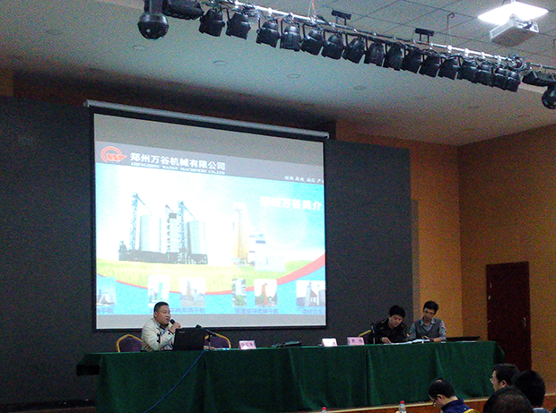 鄭州萬谷機(jī)械有限公司由張彥亭副總經(jīng)理帶領(lǐng)公司技術(shù)、銷售專業(yè)團(tuán)隊攜公司新產(chǎn)品參加本次會議。在培訓(xùn)會議開始前,鄭州萬谷攜帶的設(shè)備模型和企業(yè)展板剛一展示,立刻有眾多的參會代表圍了上來,一邊觀看產(chǎn)品宣傳信息一邊向公司人員咨詢。針對本次培訓(xùn)會參會人員的實(shí)際需求,鄭州萬谷機(jī)械有限公司此次向參會人員推薦了四款產(chǎn)品:小型循環(huán)式烘干機(jī)、小型連續(xù)循環(huán)兩用烘干機(jī)、連續(xù)式順逆流烘干機(jī)和連續(xù)式混流烘干機(jī)。根據(jù)會議安排,公司糧食烘干技術(shù)負(fù)責(zé)人李志剛在培訓(xùn)會上向參會人員詳細(xì)介紹了產(chǎn)品技術(shù)優(yōu)勢和企業(yè)實(shí)力,并根據(jù)合作社不同規(guī)模的種植面積采取何種烘干機(jī)提供了參考意見。