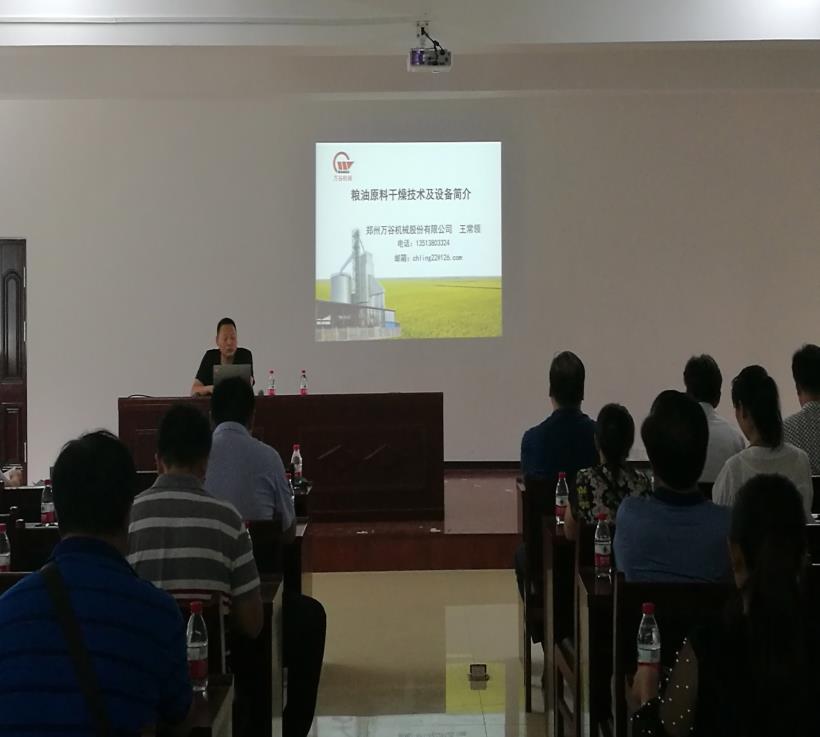 隨后鄭州萬谷總經(jīng)理助理王常領(lǐng)在公司大會議室為學(xué)員們授課,王常領(lǐng)經(jīng)理分別就“糧食干燥的必要性”、“糧食干燥機的分類”以及“糧食烘干生產(chǎn)線及主要設(shè)備”進行了技術(shù)培訓(xùn)和交流,王常嶺經(jīng)理提到2017年駐馬店正陽和南陽唐河的花生主要生產(chǎn)地遭受了嚴(yán)重澇災(zāi),當(dāng)?shù)剞r(nóng)民損失慘重,事后萬谷機械投資巨大,用于花生干燥項目的研制并取得了顯著成效,萬谷牌糧食烘干機在全國各地的國家儲備庫、農(nóng)場和糧食加工企業(yè)等不同場合發(fā)揮著糧食減損保質(zhì)的重要作用。