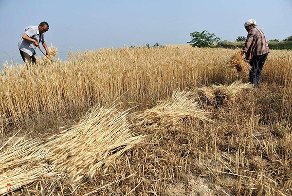 那時的農(nóng)業(yè)生產(chǎn)幾乎還是原始的耕作方式,麥子的收割完全靠手工,有的是用鐮割,也有用鏟的,割下的麥子堆成一堆,然后再用拉車運到打麥場里。打麥場是提前平整的一塊光地,一般都是幾家相鄰鄉(xiāng)親共用的,先把地里的莊稼提前收了,平整土地,再用牲口拉著石磙一遍又一遍的碾壓,把場地修整的光滑平整又堅硬。收割的麥子在打麥場里先晾曬,天好的的時候,帶著麥穗的的麥稈厚厚的平鋪在麥場里,用?;蛘唏R拉著石磙一圈一圈的碾壓。