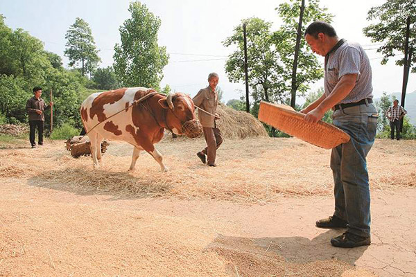 兒時的回憶里,爺爺總是養(yǎng)著一頭牛,那是家里最貴重的財產(chǎn)和勞動力,一年四季的農(nóng)活離不開老牛的辛勤勞動。打麥場里,爺爺總是個好把式,印象里爺爺站在麥場中間,手里牽著牛繩、拿著鞭子,隨著一聲聲吆喝和手里繩子的松緊掌控,老牛默默地在麥場里一圈一圈的走著,并不停地變換著路徑,確保場地里每一處的麥子被均勻地的碾壓。孩子們體會不到父輩們勞作的辛苦,只顧著自己找樂子,石磙后面拖著的一塊石板常常成為我們的“坐騎”,坐在上面,任由老牛一圈圈的拉著,一個不注意就會 “人仰馬翻”,好在地上有松軟的麥秸,也傷不到,最多粘一身的麥秸,然后嘻嘻哈哈的跑村前小河里洗澡了。