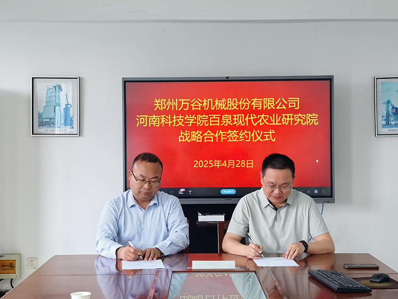 劉潤強教授與公司專項課題負責人及研發(fā)團隊就專項進行了充分研討交流,雙方各自通報了課題實施進展情況,并對課題間的創(chuàng)新協(xié)作以及未來校企合作規(guī)劃深入溝通交流。隨后雙方一致同意達成校企戰(zhàn)略合作關(guān)系,劉潤強教授和公司負責人共同簽署了河南科技學院百泉現(xiàn)代農(nóng)業(yè)研究院與鄭州萬谷機械股份有限公司戰(zhàn)略合作協(xié)議。雙方將在科技創(chuàng)新、人才培養(yǎng)以及成果轉(zhuǎn)化等方面實現(xiàn)資源共享和共同發(fā)展。