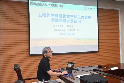 會(huì)上,省科技廳領(lǐng)導(dǎo)薛長(zhǎng)江對(duì)項(xiàng)目實(shí)施提出了要求與指導(dǎo)意見(jiàn);河南科技大學(xué)副校長(zhǎng)侯小改講授表示學(xué)校將大力支持項(xiàng)目實(shí)施,同時(shí)也要求各項(xiàng)目組要加強(qiáng)協(xié)作,高質(zhì)量的完成項(xiàng)目研發(fā);姬江濤教授介紹了項(xiàng)目整體實(shí)施方案與安排部署。隨后,十個(gè)課題組的負(fù)責(zé)人分別對(duì)上一階段研究進(jìn)展進(jìn)行了匯報(bào)。鄭州萬(wàn)谷機(jī)械股份有限公司作為課題十“主糧產(chǎn)后智能加工裝備研發(fā)與應(yīng)用示范”的承擔(dān)單位,張德榜高工對(duì)主糧作物產(chǎn)后智能加工裝備關(guān)鍵技術(shù)有關(guān)實(shí)施方案與進(jìn)展進(jìn)行了匯報(bào)。